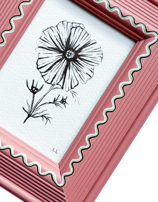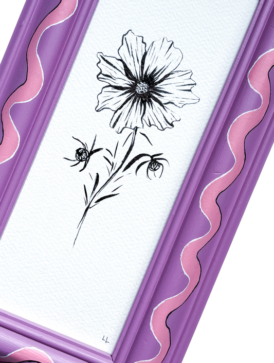 COSMOS ORIGINAL INK ARTWORK IN A HAND PAINTED PINK WITH GREEN WIGGLE FRAME