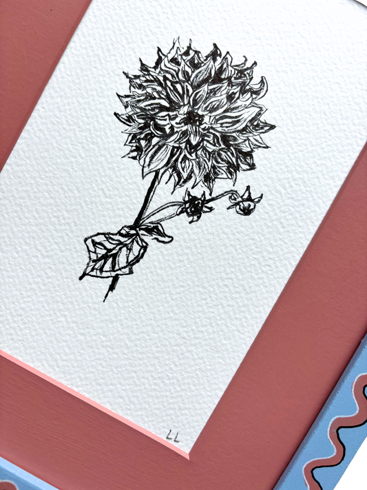 DAHLIA ORIGINAL INK ARTWORK IN A HAND PAINTED BLUE AND PINK FRAME WITH A PINK MOUNT