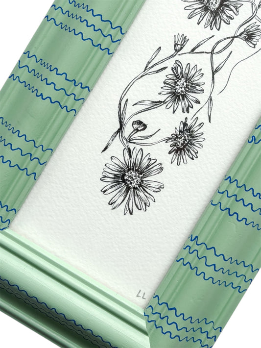 DAISY ORIGINAL INK ARTWORK IN A HAND PAINTED GREEN WITH BLUE WIGGLE PRELOVED FRAME