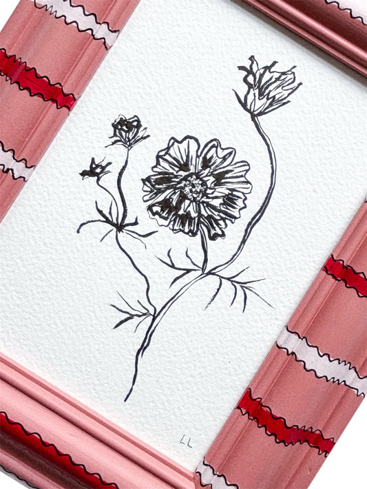 DAISY ORIGINAL INK ARTWORK IN A HAND PAINTED PINK AND RED PRELOVED FRAME