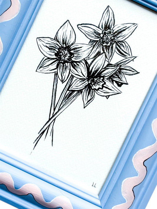 DAFFODILS ORIGINAL INK ARTWORK IN A HAND PAINTED BLUE AND PINK PRELOVED FRAME