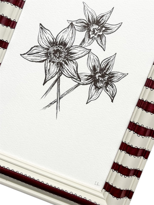 DAFFODILS ORIGINAL INK ARTWORK IN A HAND PAINTED CREAM AND BURGUNDY STRIPE PRELOVED FRAME