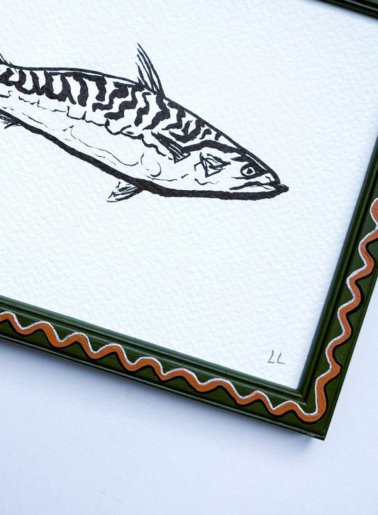 FISH ORIGINAL INK ARTWORK IN A HAND PAINTED GREEN AND TAN PRELOVED FRAME