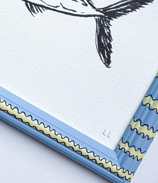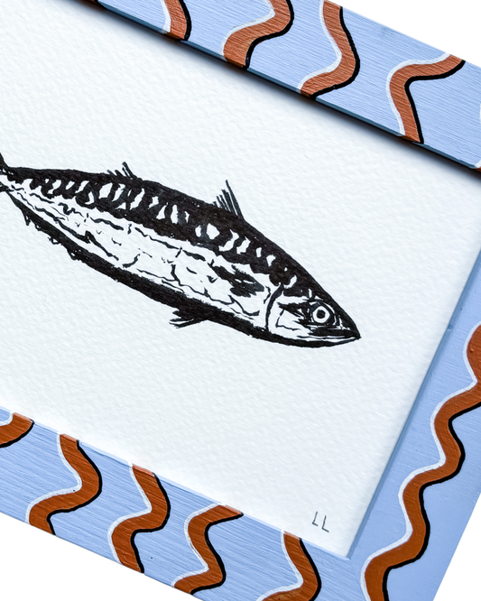FISH ORIGINAL INK ARTWORK IN A HAND PAINTED BLUE AND TAN PRELOVED FRAME