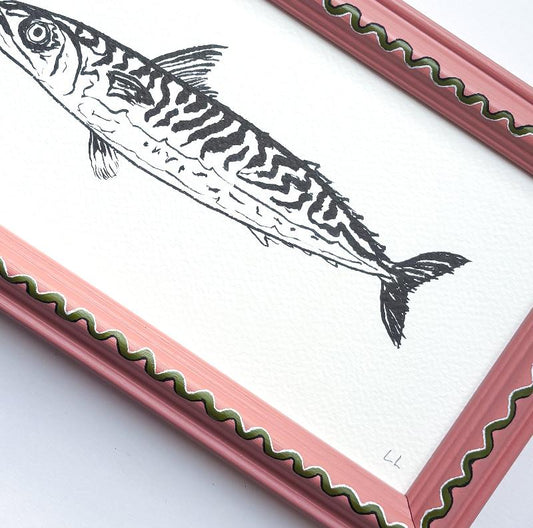 FISH ORIGINAL INK ARTWORK IN A HAND PAINTED PINK AND GREEN PRELOVED FRAME