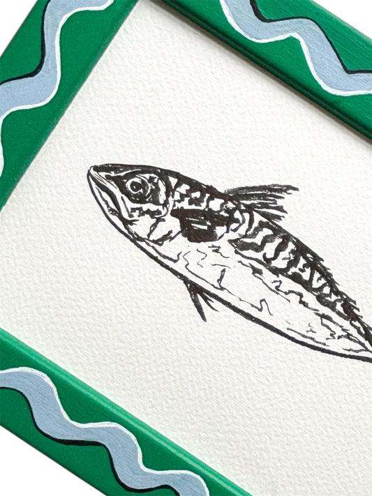 FISH ORIGINAL INK ARTWORK IN A HAND PAINTED GREEN AND BLUE PRELOVED FRAME