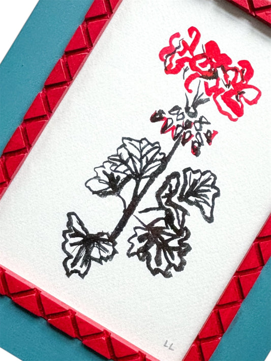 GERANIUM ORIGINAL INK ARTWORK IN A HAND PAINTED BLUE AND BURGUNDY WIGGLE PRELOVED FRAME