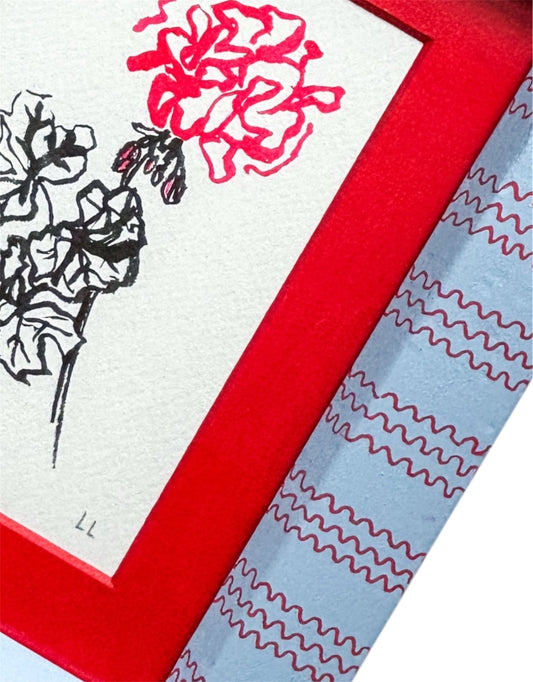 GERANIUM ORIGINAL INK ARTWORK IN A HAND PAINTED PALE BLUE AND RED WIGGLE STRIPE PRELOVED FRAME WITH RED MOUNT