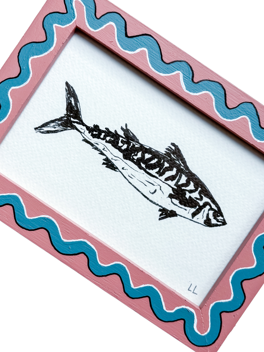 FISH ORIGINAL INK ARTWORK IN A HAND PAINTED PINK AND BLUE PRELOVED FRAME