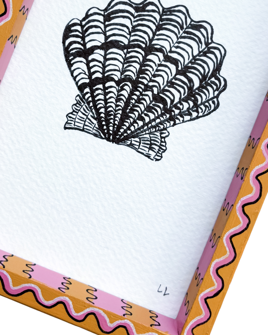SCALLOP SHELL ORIGINAL INK ARTWORK IN A HAND PAINTED PINK AND YELLOW PRELOVED FRAME
