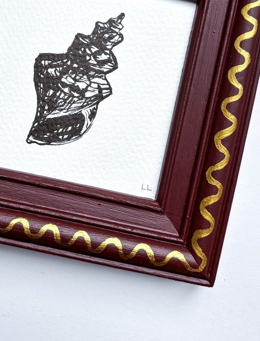 SHELL ORIGINAL INK ARTWORK IN A HAND PAINTED BURGUNDY AND GOLD PRELOVED FRAME