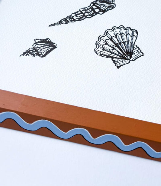 SCATTERED SHELLS ORIGINAL INK ARTWORK IN A HAND PAINTED TAN AND BLUE PRELOVED FRAME