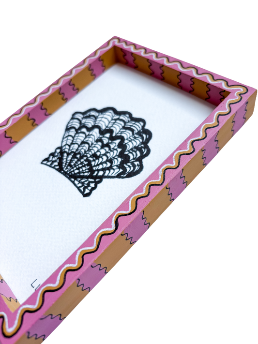 SCALLOP SHELL ORIGINAL INK ARTWORK IN A HAND PAINTED PURPLE AND PALE PINK WIGGLE AND STRIPED PRELOVED FRAME