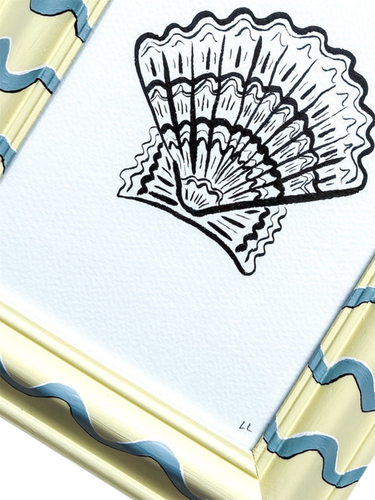 SCALLOP SHELL ORIGINAL INK ARTWORK IN A HAND PAINTED YELLOW AND BLUE WIGGLE PRELOVED FRAME