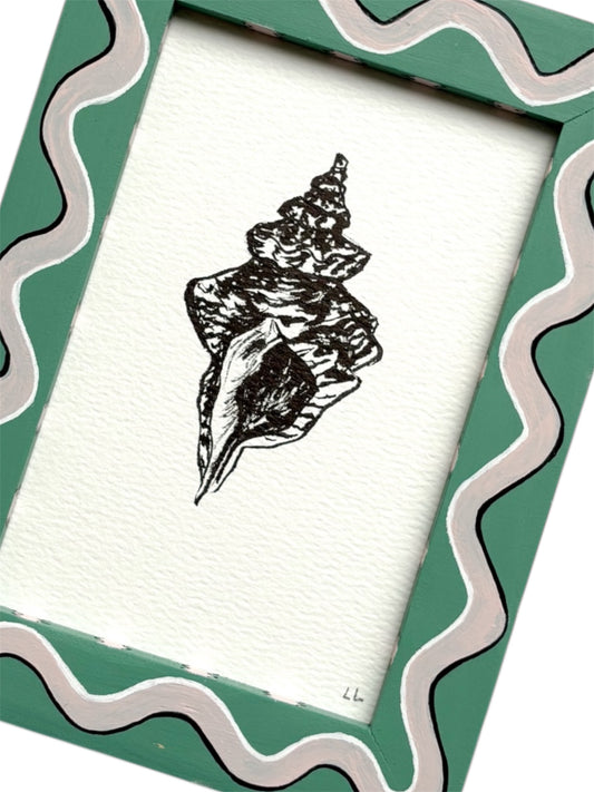 SMALL SCALLOP ORIGINAL INK ARTWORK IN A HAND PAINTED GREEN AND PINK WIGGLE FRAME