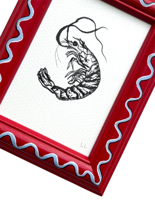 PRAWN ORIGINAL INK ARTWORK IN A HAND PAINTED RED AND BLUE WIGGLE FRAME