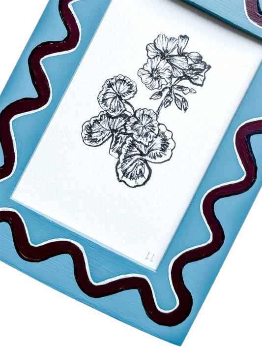 GERANIUM ORIGINAL INK ARTWORK IN A HAND PAINTED BLUE AND BURGUNDY WIGGLE PRELOVED FRAME
