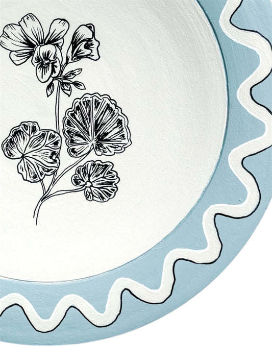 GERANIUM ORIGINAL ARTWORK ON A HAND PAINTED BLUE AND CREAM PRELOVED WOODEN PLATE