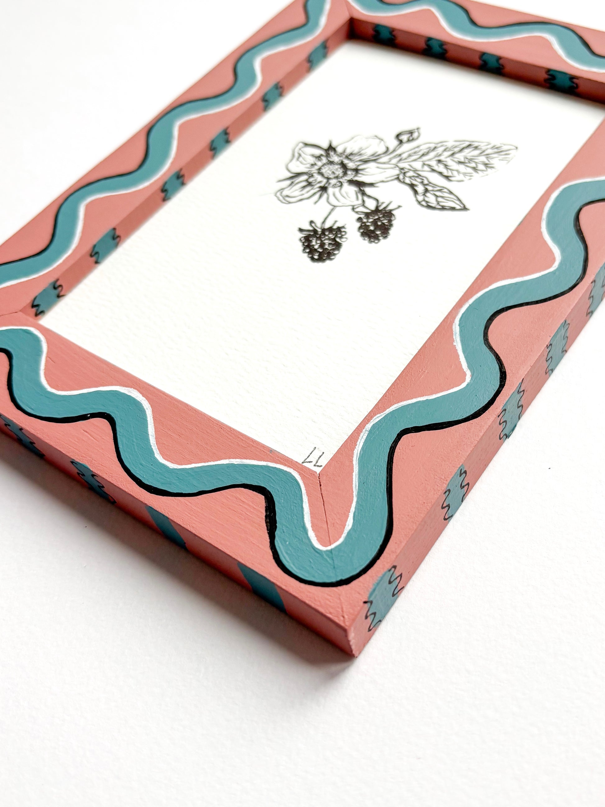 BLACKBERRY ORIGINAL INK ARTWORK IN A HAND PAINTED PINK AND BLUE WIGGLE AND STRIPED PRELOVED FRAME
