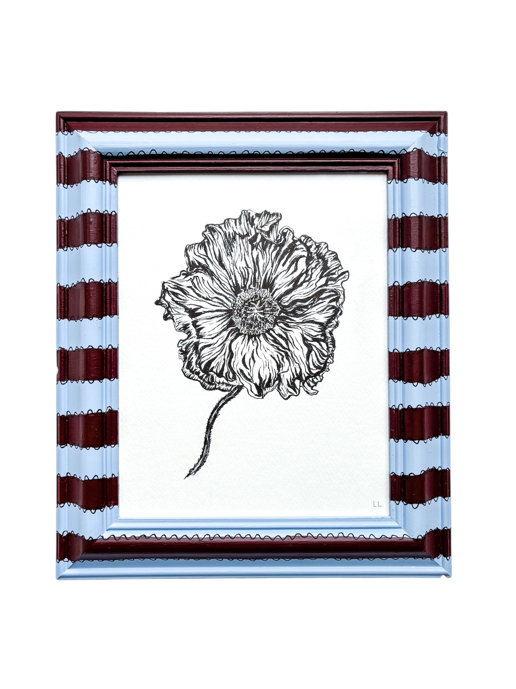 Original ink drawing of an Icelandic Poppy flower on watercolour paper framed in a Blue and Burgundy stripe hand painted preloved (vintage) frame, which I use for sustainability and style.