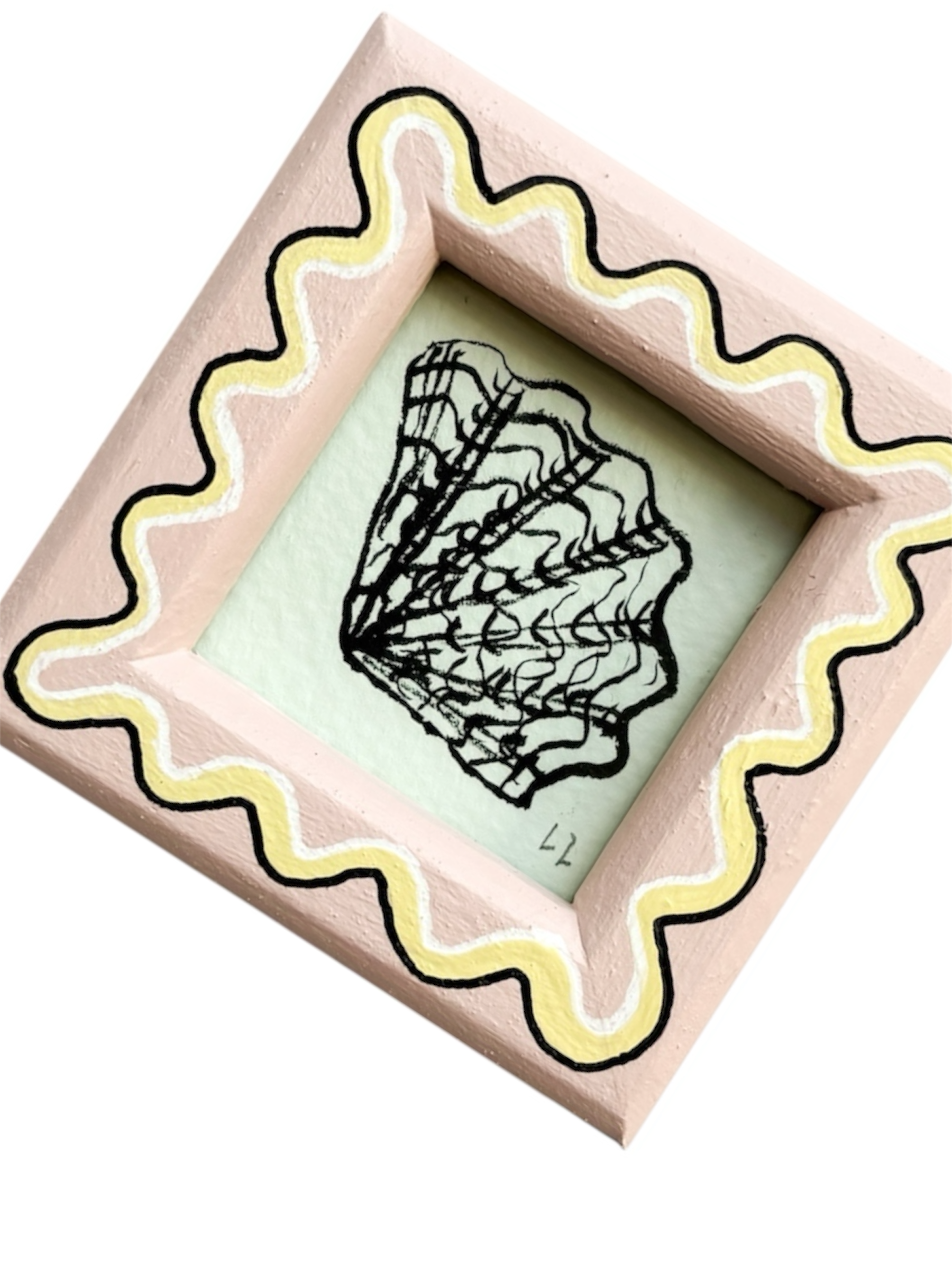 MINI SHELL ORIGINAL INK ARTWORK IN A HAND PAINTED PINK AND YELLOW WIGGLE FRAME