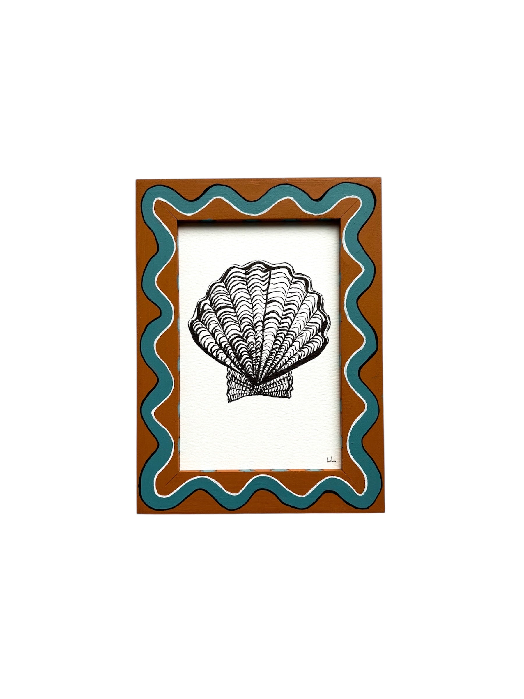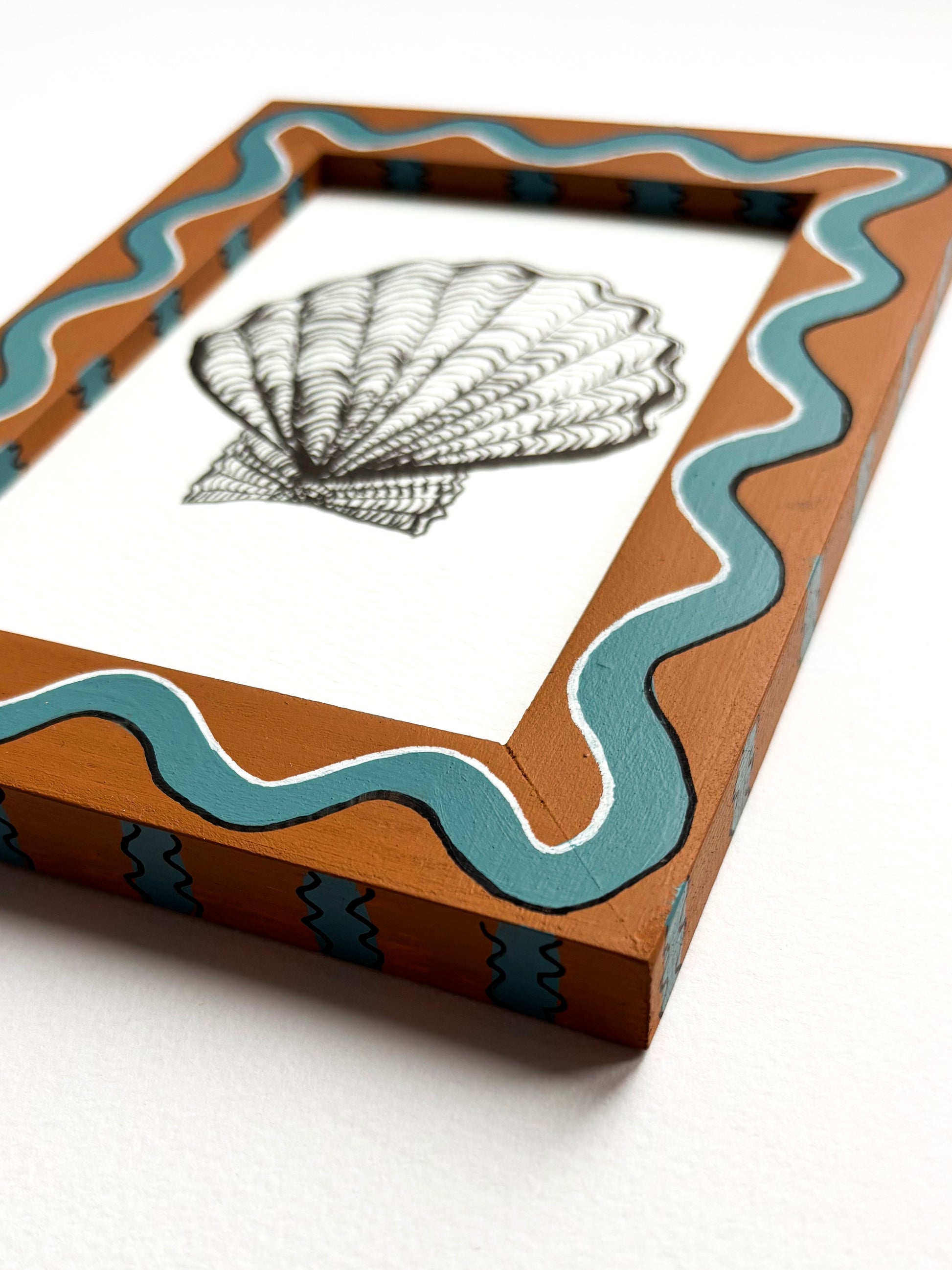 Original ink drawing of a Scallop Shell on watercolour paper framed in a Brown and Blue wiggle and striped hand painted preloved (vintage) frame, which I use for sustainability and style.
