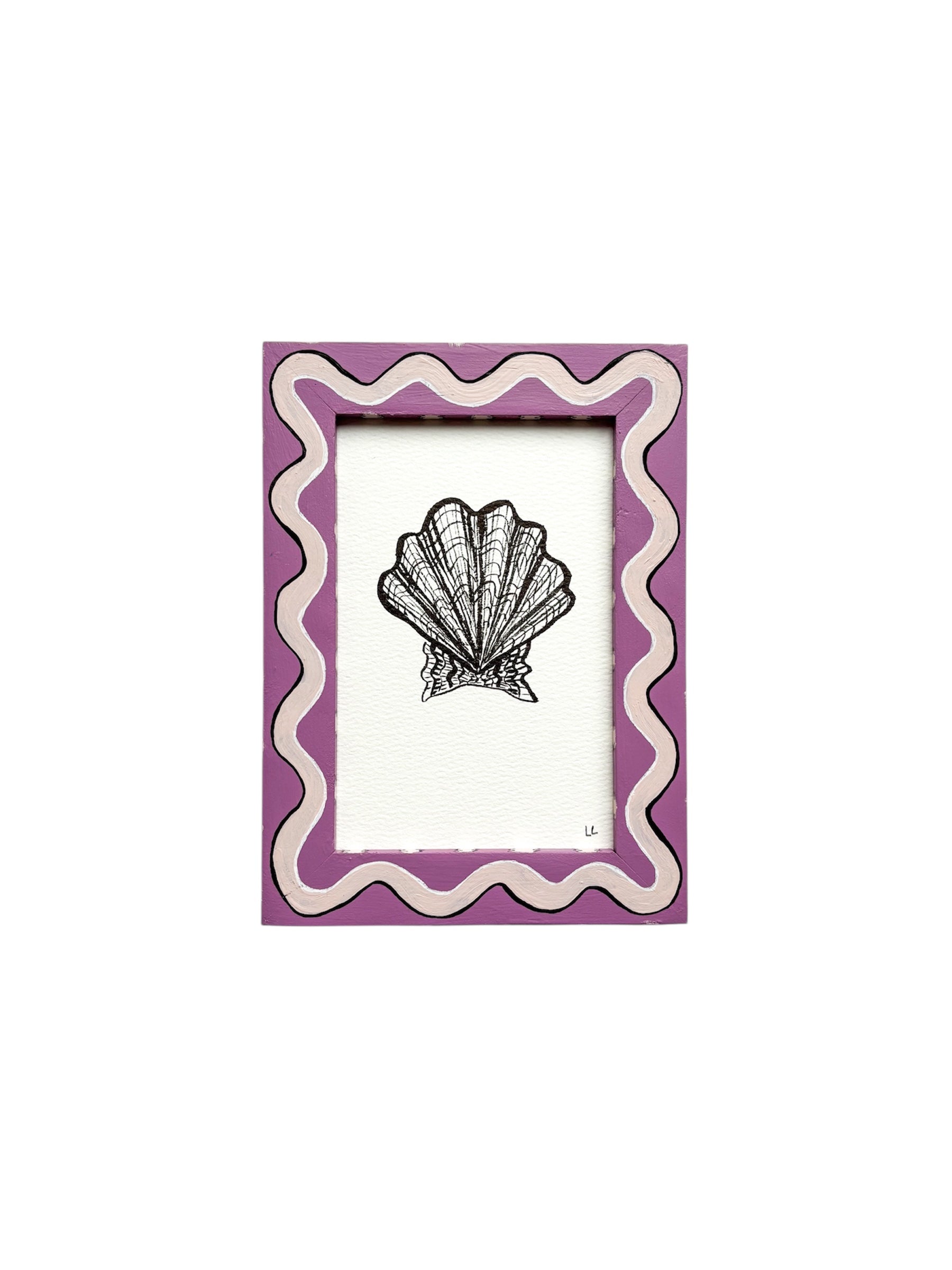 Original ink drawing of a Scallop Shell on watercolour paper framed in a Purple and Pale Pink wiggle and striped hand painted preloved (vintage) frame, which I use for sustainability and style.