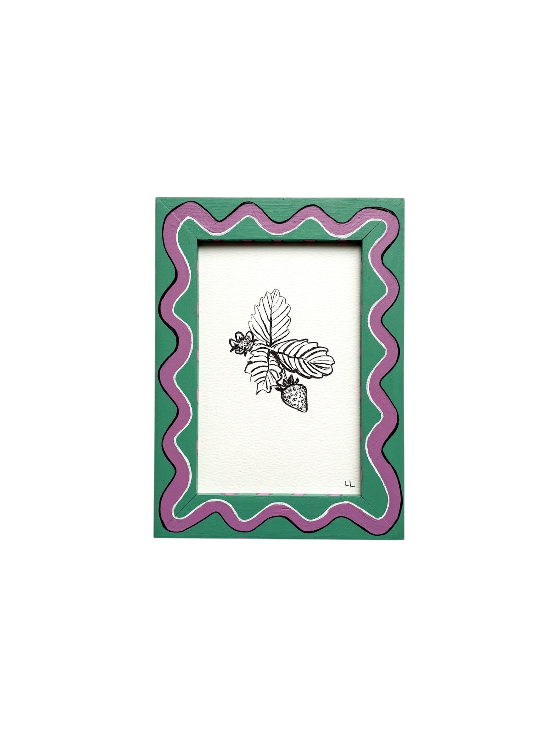 STRAWBERRY ORIGINAL INK ARTWORK IN A HAND PAINTED GREEN AND PURPLE WIGGLE AND STRIPED PRELOVED FRAME